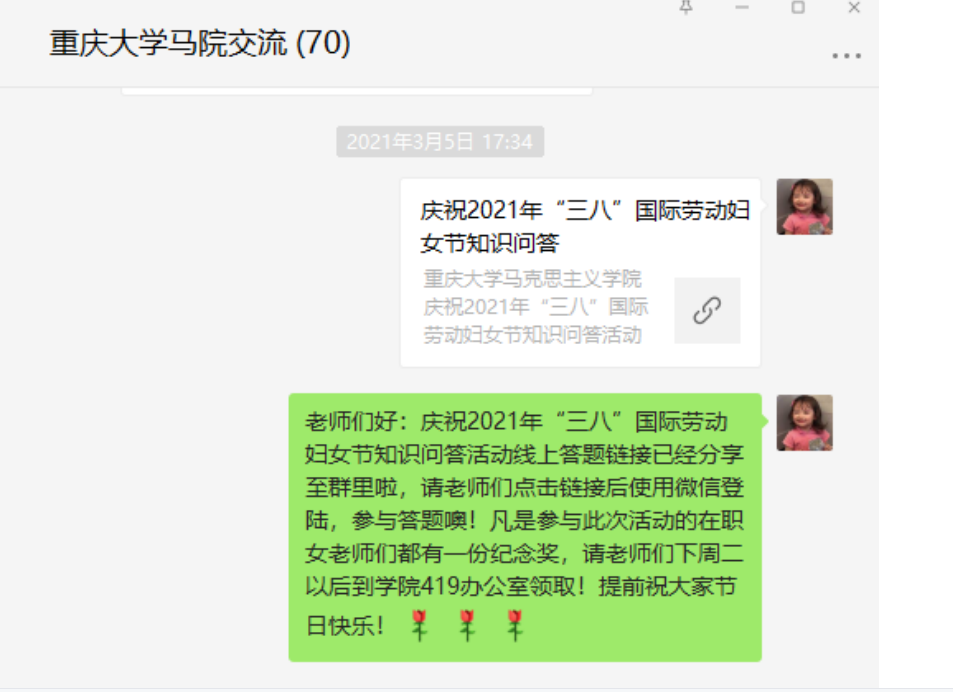 2021年3月,为庆祝第111个国际劳动妇女节的到来,学院工会组织开展系列活动进行庆祝,丰富学院教师生活。3月5日,学院工会开展了线上知识问答活动,知识问答题目包括《新婚姻法》等内容,学院教职工通过微信群小程序积极参与答题活动,线上答题达到90余次,丰富了工作学习生活的同时,老师们也学习了新的法律知识。