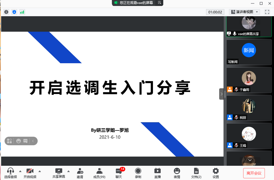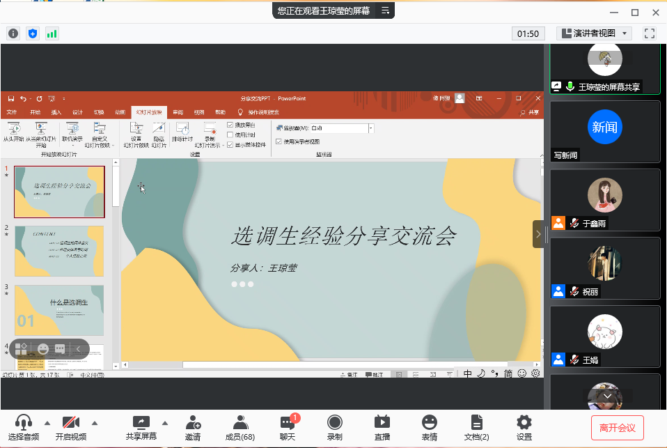 成功考取选调生的王琼莹、秦中原、罗旭、姜越亚4位2021届毕业研究生进行经验分享。此次活动约90名同学参与。