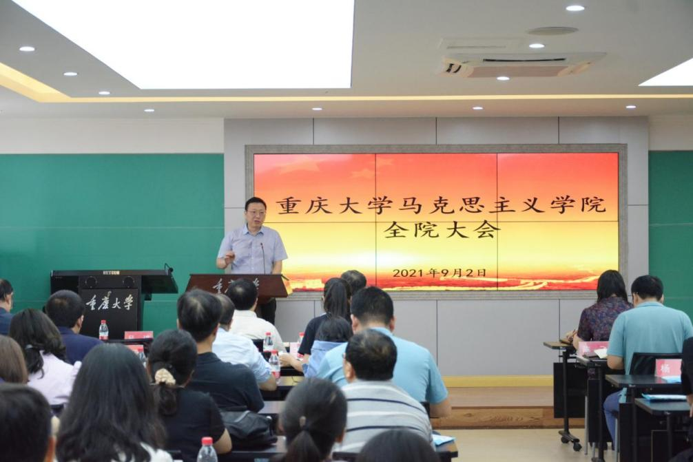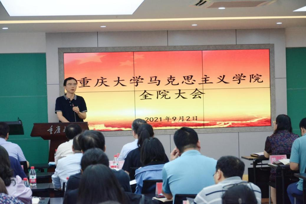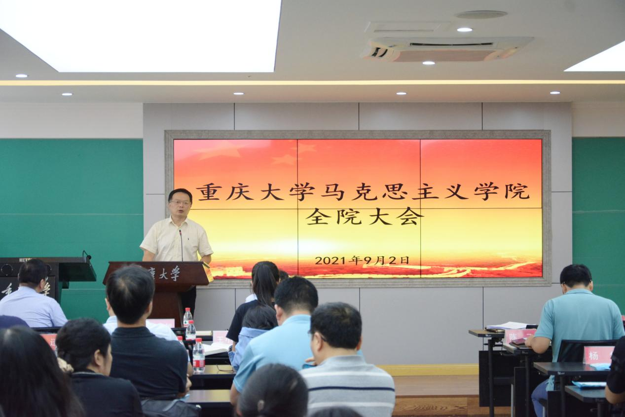 在408教室召开2021年第六次全院大会,学院领导班子及全体教职工参会,会议由党委书记罗滌主持。