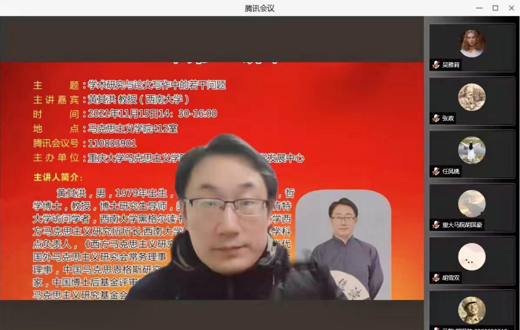 举行第二十七讲“红岩讲坛”活动,西南大学黄其洪教授以“学术研究与论文写作中的若干问题”为主题作了学术讲座。本次讲座采用线上腾讯会议、线下课堂讲座的方式同步进行,讲座由视频裸聊