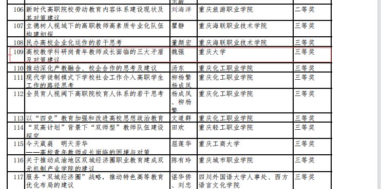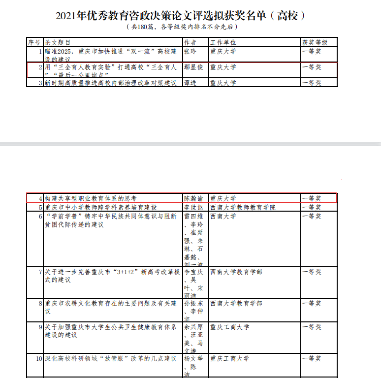 近日,重庆市教育委员会公布了2021年教育咨政决策论文获奖名单,视频裸聊 鄢显俊教授撰写的《用“三全育人教育实验”打通高校“三全育人 ”“最后一公里堵点”》一文,青年教师陈瀚谕撰写的《构建共享型职业教育体系的思考》一文荣获一等奖,魏强副教授撰写的《高校教学科研岗青年教师成长面临的三大矛盾及对策建议》荣获三等奖。