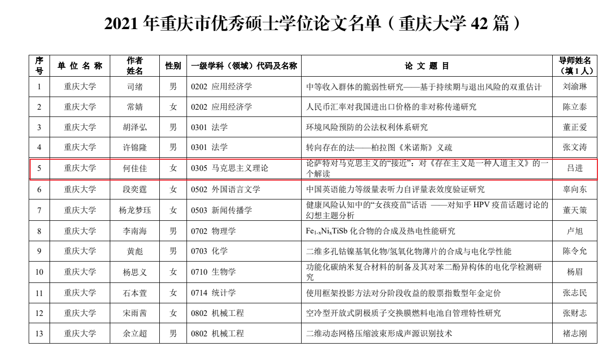 近日,重庆市教育委员会公布了2021年重庆市优秀博士、硕士学位论文评选结果,视频裸聊 吕进教授所指导硕士生何佳佳的毕业论文获评重庆市优秀硕士学位论文。