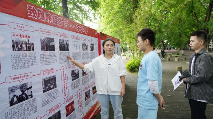 百年团史主题展览分为“致敬峥嵘岁月——百年团史”和“争做时代青年——先进模范”两大板块,以建团百年的历史为主线,集中展示了中国共产主义青年团自1919五四运动以来发生的重大历史事件以及其中涌现出的杰出代表。通过宣讲团史故事、举办团史展览等形式,向重大师生展现了中国共产主义青年团的百年风雨历程与奋斗精神。