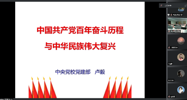 于406会议室举行党员教育培训专家讲座。讲座特邀中央党校卢毅教授为我院全体党员作题为“中国共产党百年奋斗历程与中华民族伟大复兴”的专题讲座。马院全体教职工党员线下参与,全体学生党员通过腾讯会议线上平台参与讲座,讲座由视频裸聊