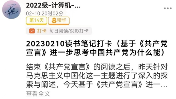 顺利举行第三十三期“红岩读书会”读书观影交流活动,此次活动分为十四天打卡活动和书友见面分享会两个环节。“十四天打卡计划”于2023年1月28日至2月10日展开,报名参与本次活动的同学在推荐书目及影视作品中选取书籍和电影,坚持在微信小程序——“小打卡”组成的阅读圈里打卡14天,本次打卡活动吸引了我校多个学院的研究生参与打卡,打卡总人数47人,全勤30人,累计分享达611条,有效地调动了我校学生学习马克思主义理论的积极性和主动性。