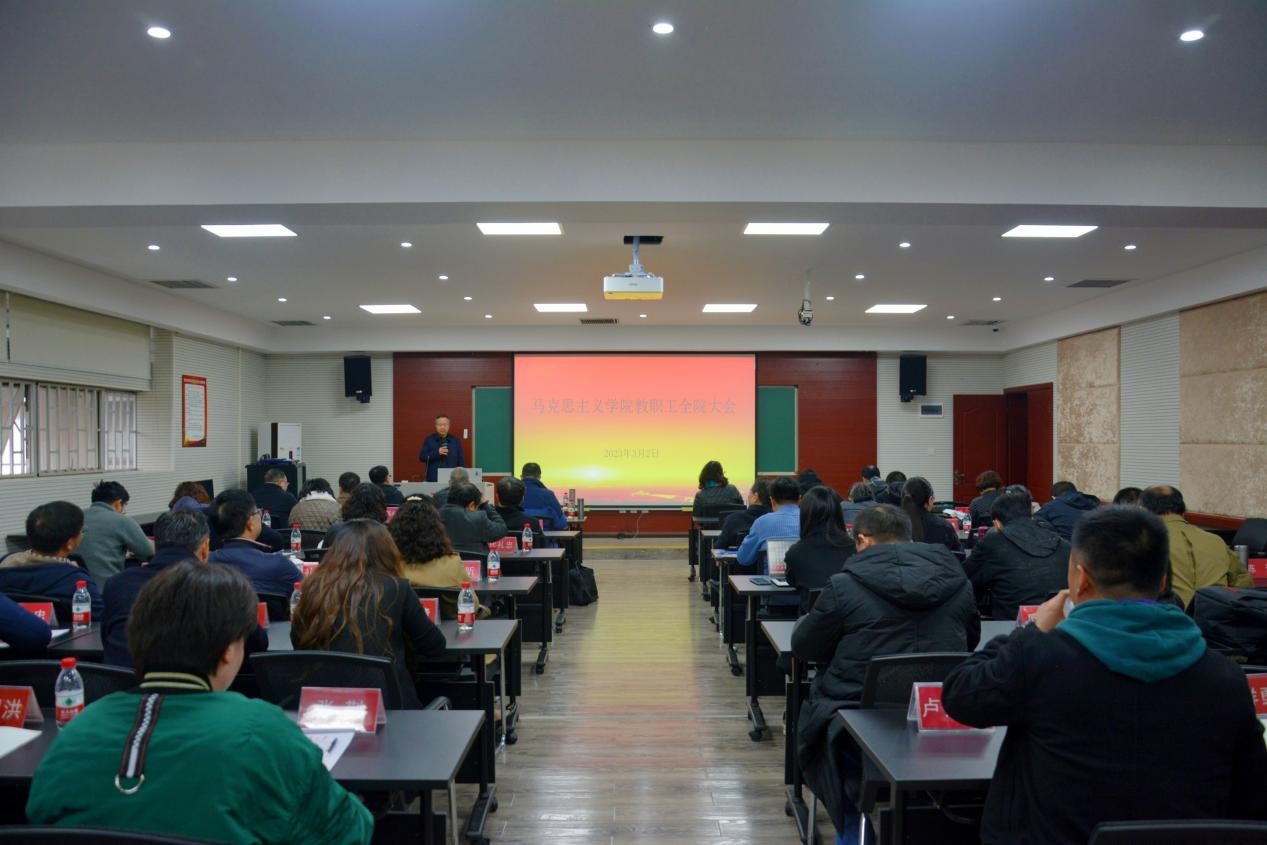 在学院414会议室召开2023年春季第一次教职工全院大会,会议由党委书记罗滌主持,学院领导班子及马院全体教职工参加会议。